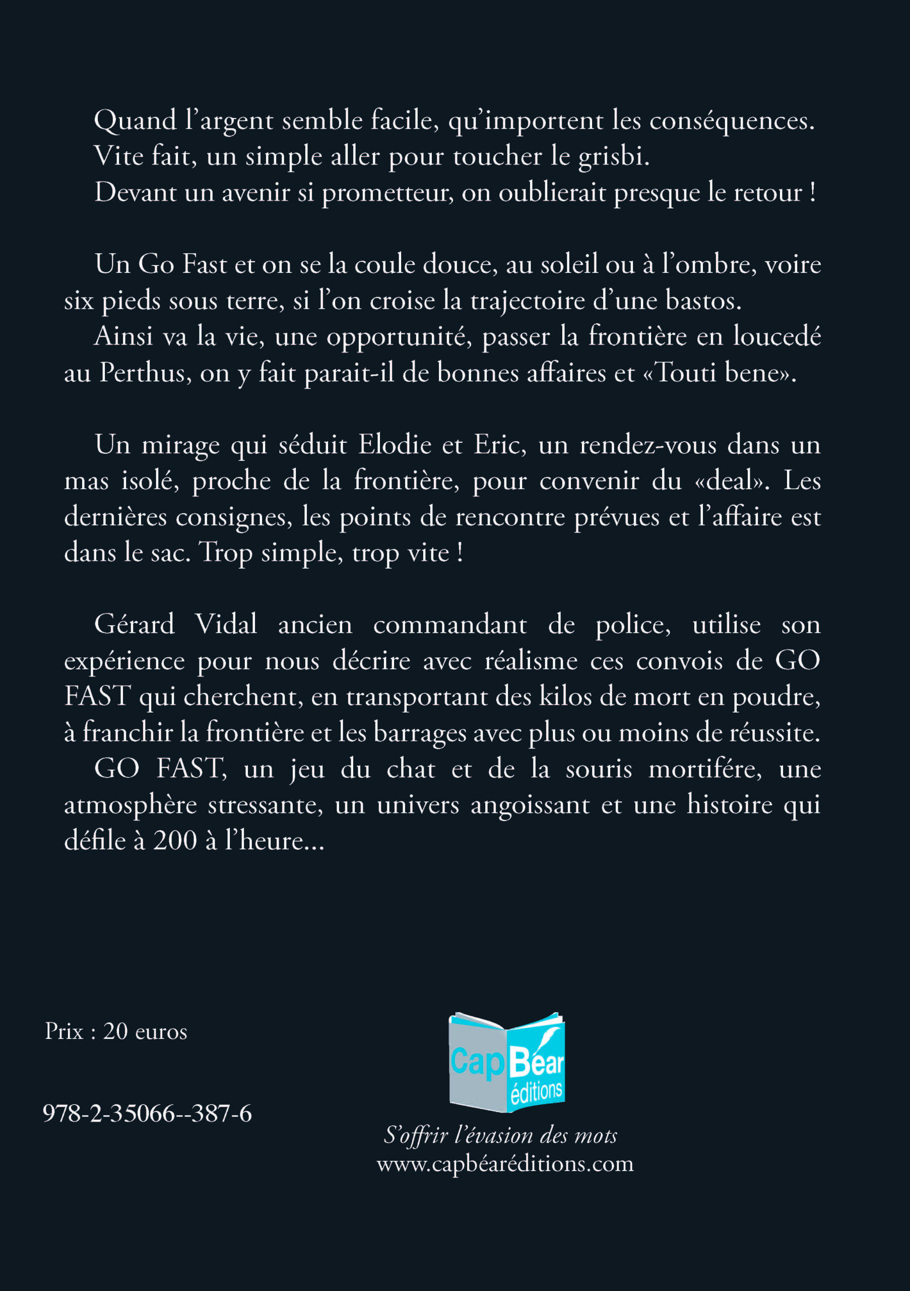 Gérard Vidal ancien commandant de police, utilise son expérience pour nous décrire avec réalisme ces convois de GO FAST qui cherchent, en transportant des kilos de mort en poudre, à franchir la frontière et les barrages avec plus ou moins de réussite.
